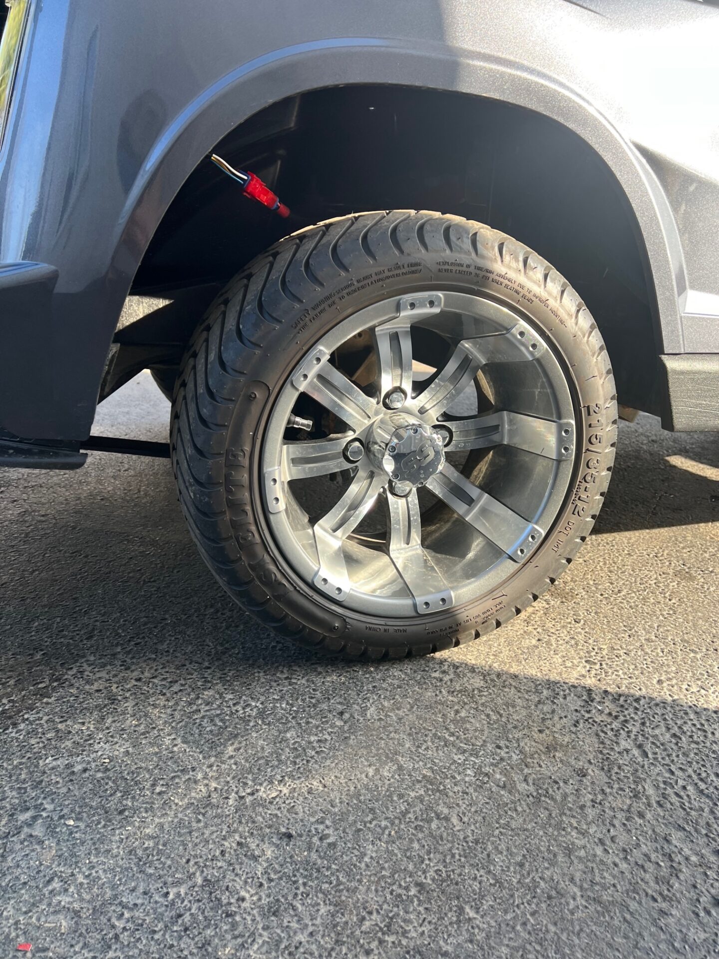 - 12″ GUN METAL & SILVER RIMS WITH STREET TIRES