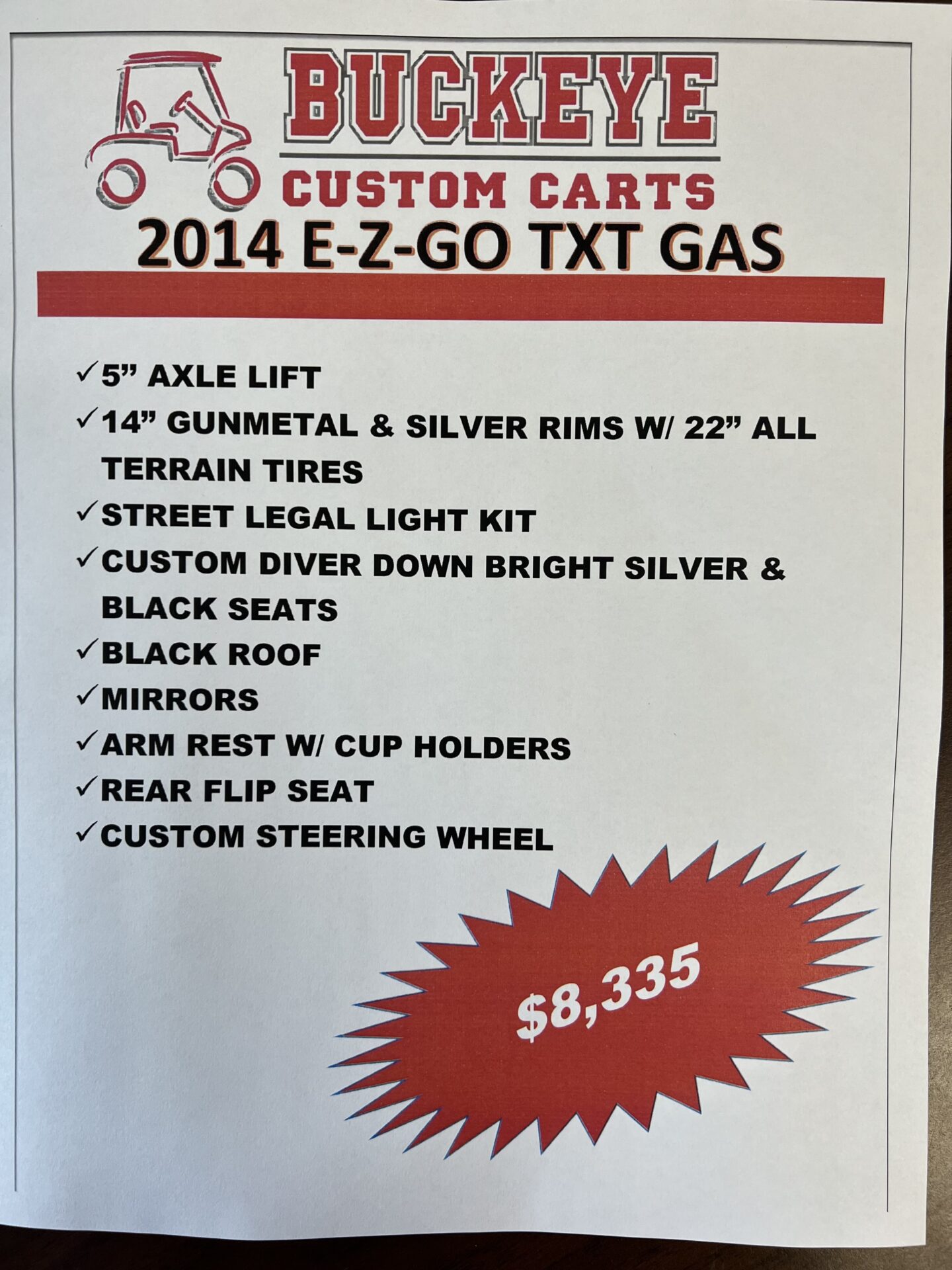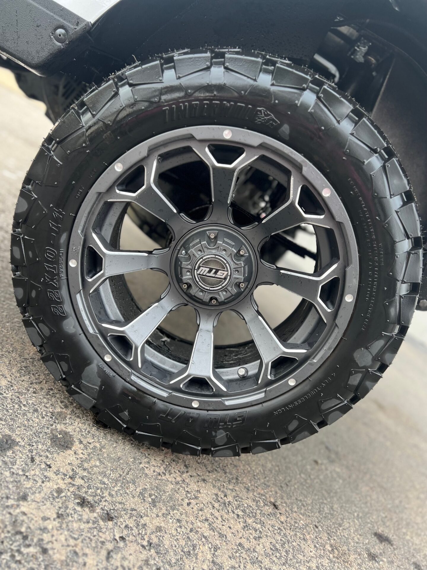- 14″ GUN METAL & SILVER RIMS W/ 22″ ALL TERRAIN TIRES