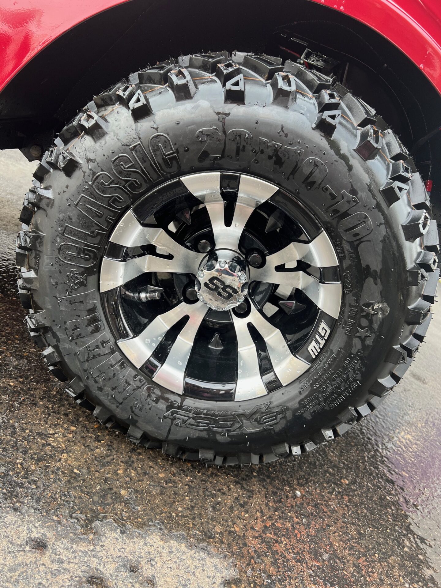 - 10″ BRUSHED ALUMINUM & BLACK RIMS W/ 20″ ALL TERRAIN TIRES