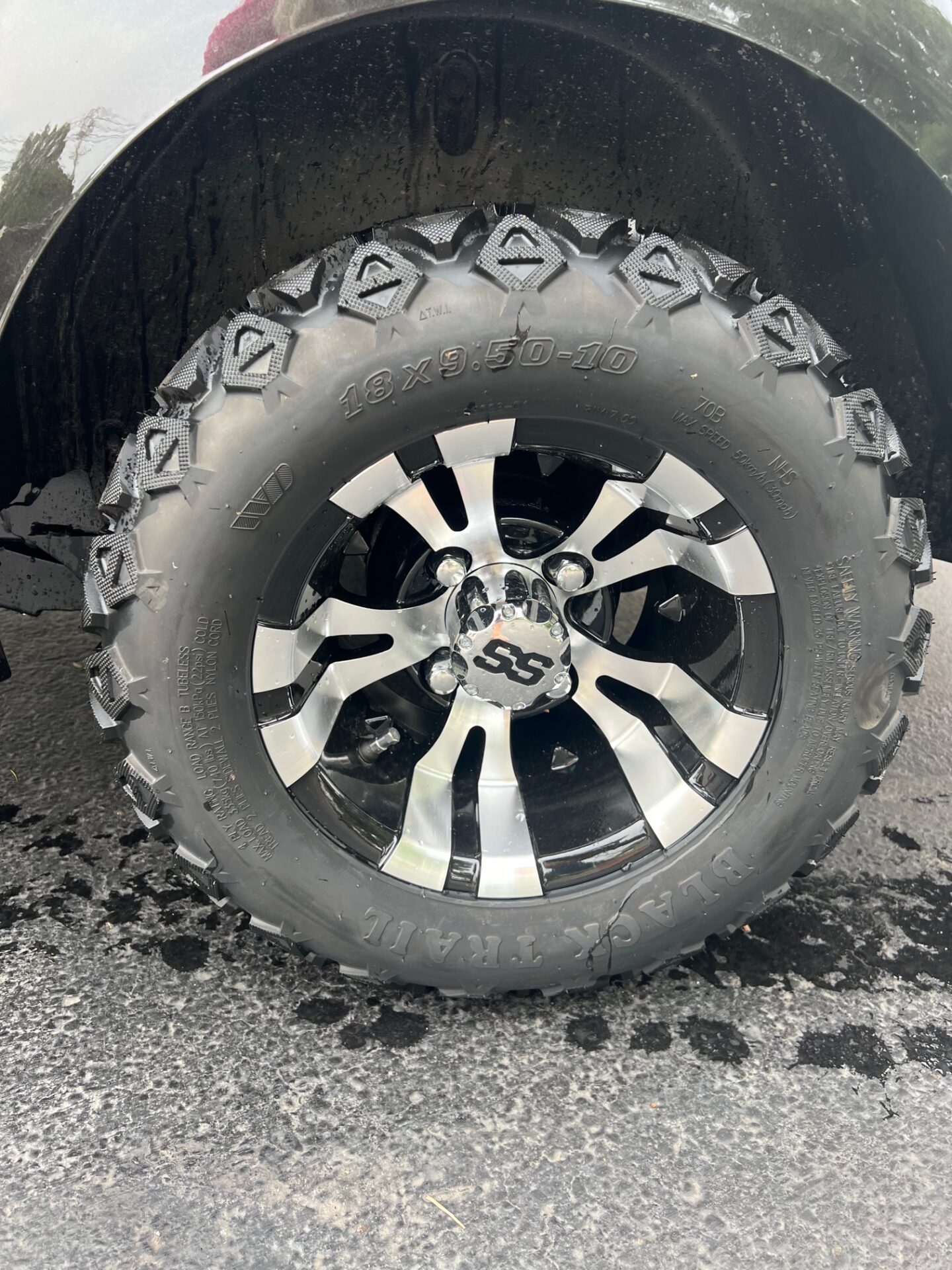 - custom 10″ rims w/ 18″ all terrain tires