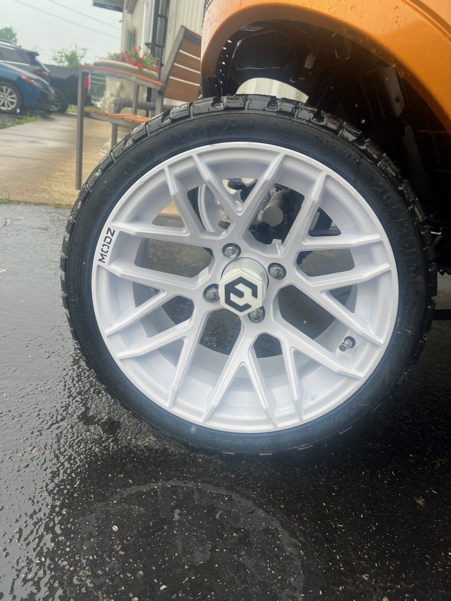 - 14″ white modz rims w/ street tires